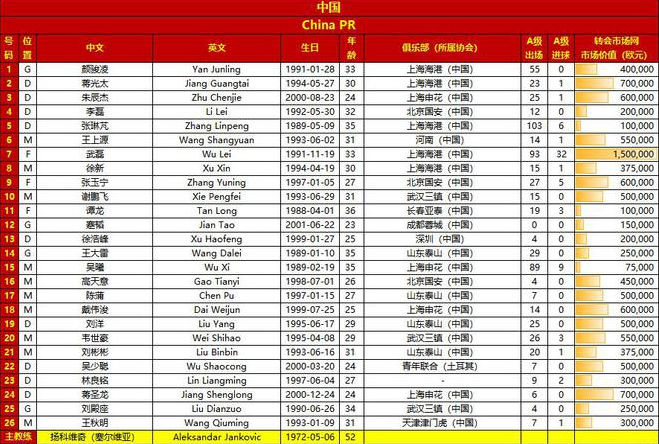中国(442):1-颜骏凌;4-李磊(60’19-刘洋)、2-朱辰杰、3-蒋圣龙(86’17-吴少聪)、5-张琳芃;20-韦世豪(77’13-戴伟浚)、15-吴曦、8-李可(60’6-王上源)、21-刘彬彬(46’10-谢鹏飞);11-谭龙、7-武磊;
